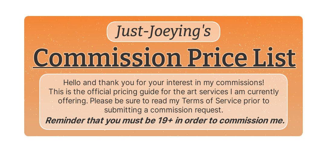 By purchasing my art services, you automatically agree to the following conditions:You must be 19+ in order to commission me. Breaking this term will result in blacklisting.Note: I reserve the right to modify these Terms of Service at any time without prior warning.My Rights